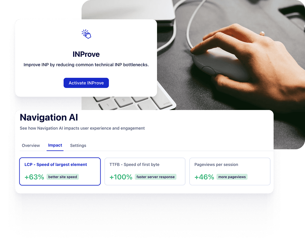 Flip a switch to enable Navigation AI and INProve—automated performance optimizations that improve LCP and INP without a single line of code.